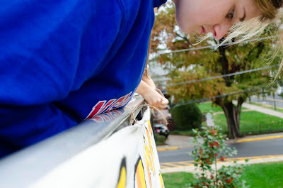 Girls in Alpha Chi Omega hung their Homecoming 2019 banner at the AXO house on October 31, 2019. (Photos by Kasey Borduas)