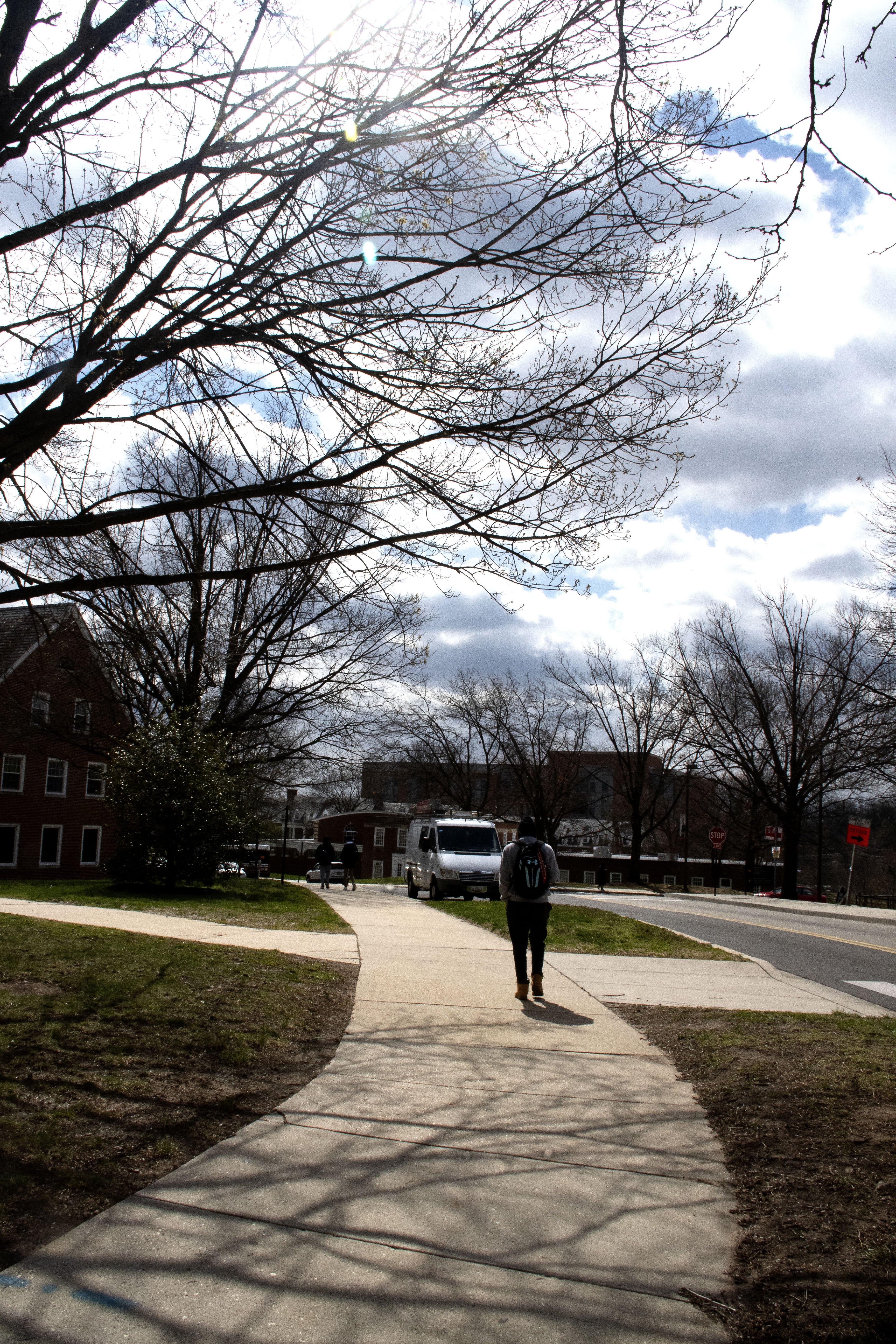 The shadow from the trees along Preinkert Drive seem to connect the grass on the sides of the sidewalk, March 28, 2022.